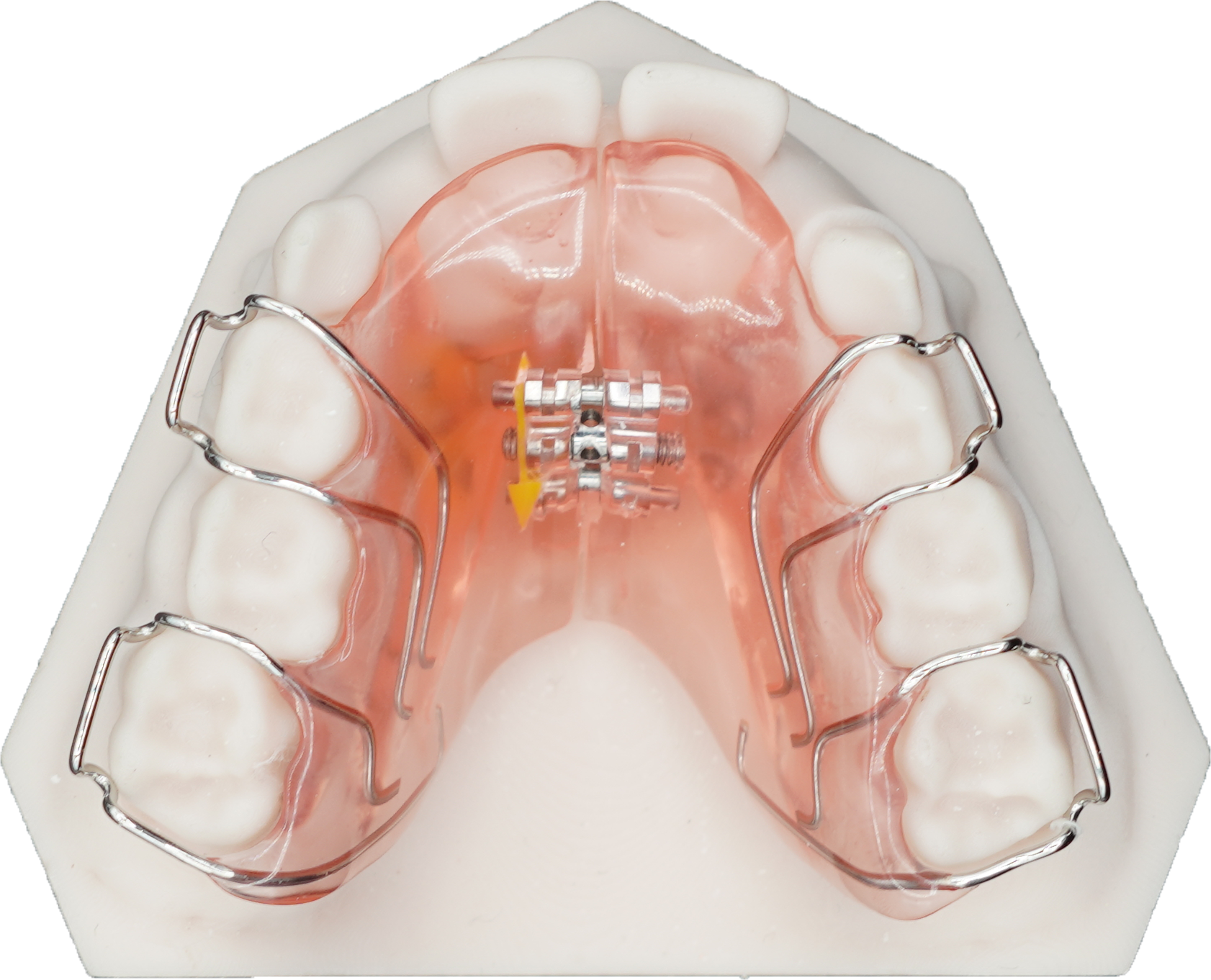 The Upper Lateral Growth Plate appliance consists of an acrylic plate with a midline expansion screw covering the palate. It is attached to the upper jaw with Adam and/or ball ended clasps.